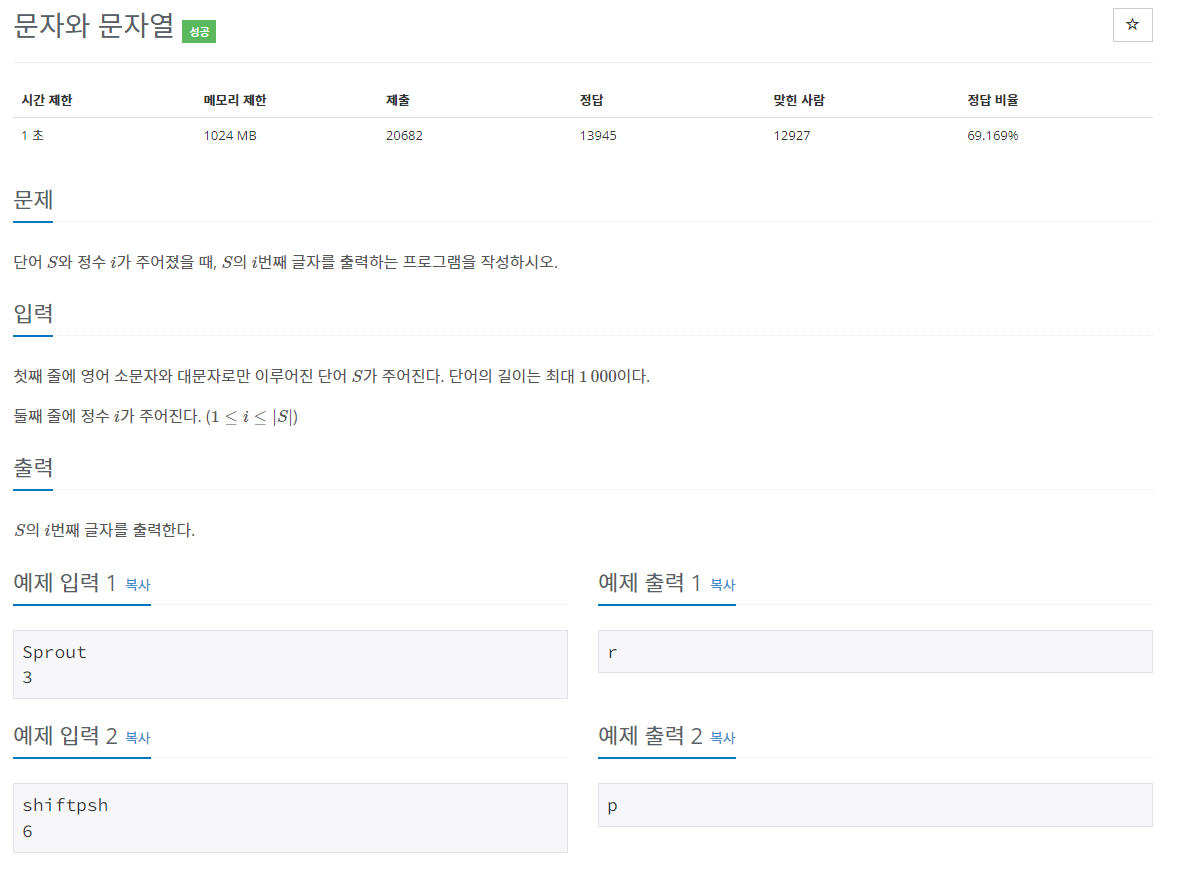 사용자에게 문자열 S와 정수 i를 입력받아 문자열에서 i번째의 위치만 문자가 어떤 문자인지 출력하는 문제이다.