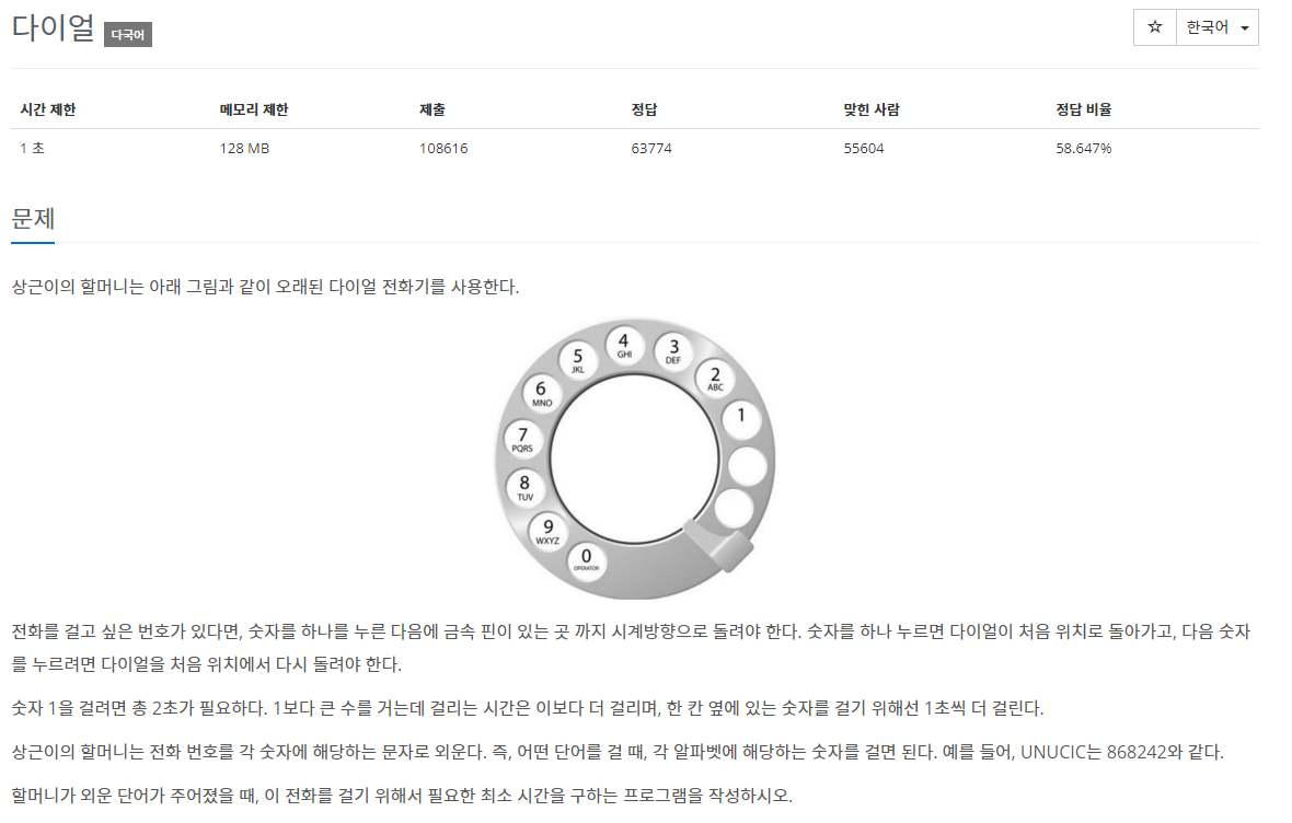 사용자에게 문자열을 입력받아 각 문자열에 속한 문자가 다이얼에 속하는 번호에 +1초를 해 모두 더한 값을 출력하는 문제이다.(+1초를 한 이유는 숫자 1이 걸리는 시간이 2초이기 때문이다.)
