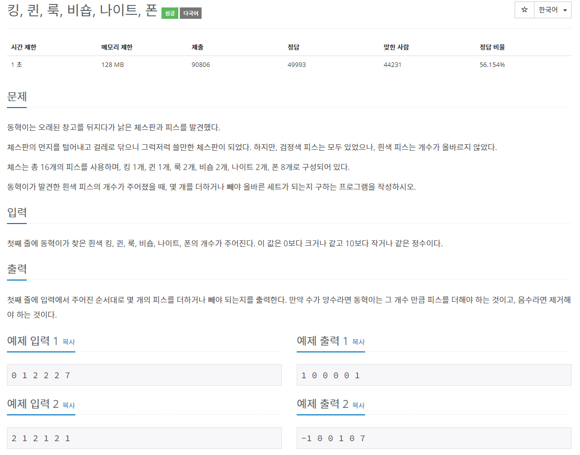 사용자에게 정수 리스트를 입력받아 각각 킹, 퀸, 룩, 비숍, 나이트, 폰 개수와 비교하여 차이를 출력하는 문제이다.